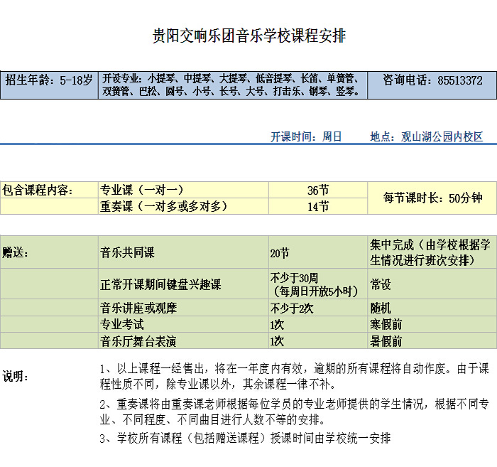 1、 贵阳交响乐团音乐学校拥有全新及全面的教学理念,为了达到专业及理想的教学成果,报名学员须接受学校所开设的必修课程,在此范围内不接受自行选择。